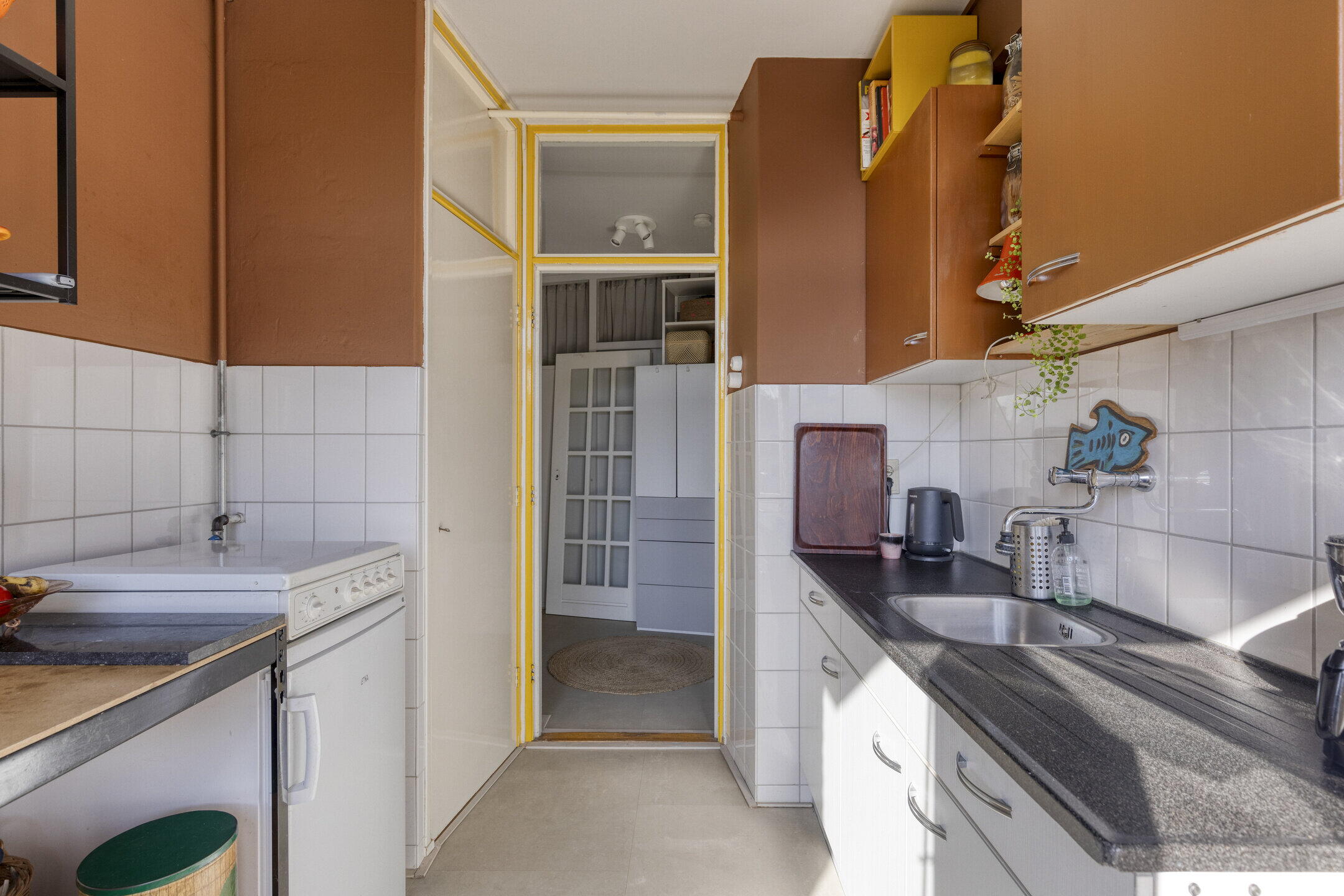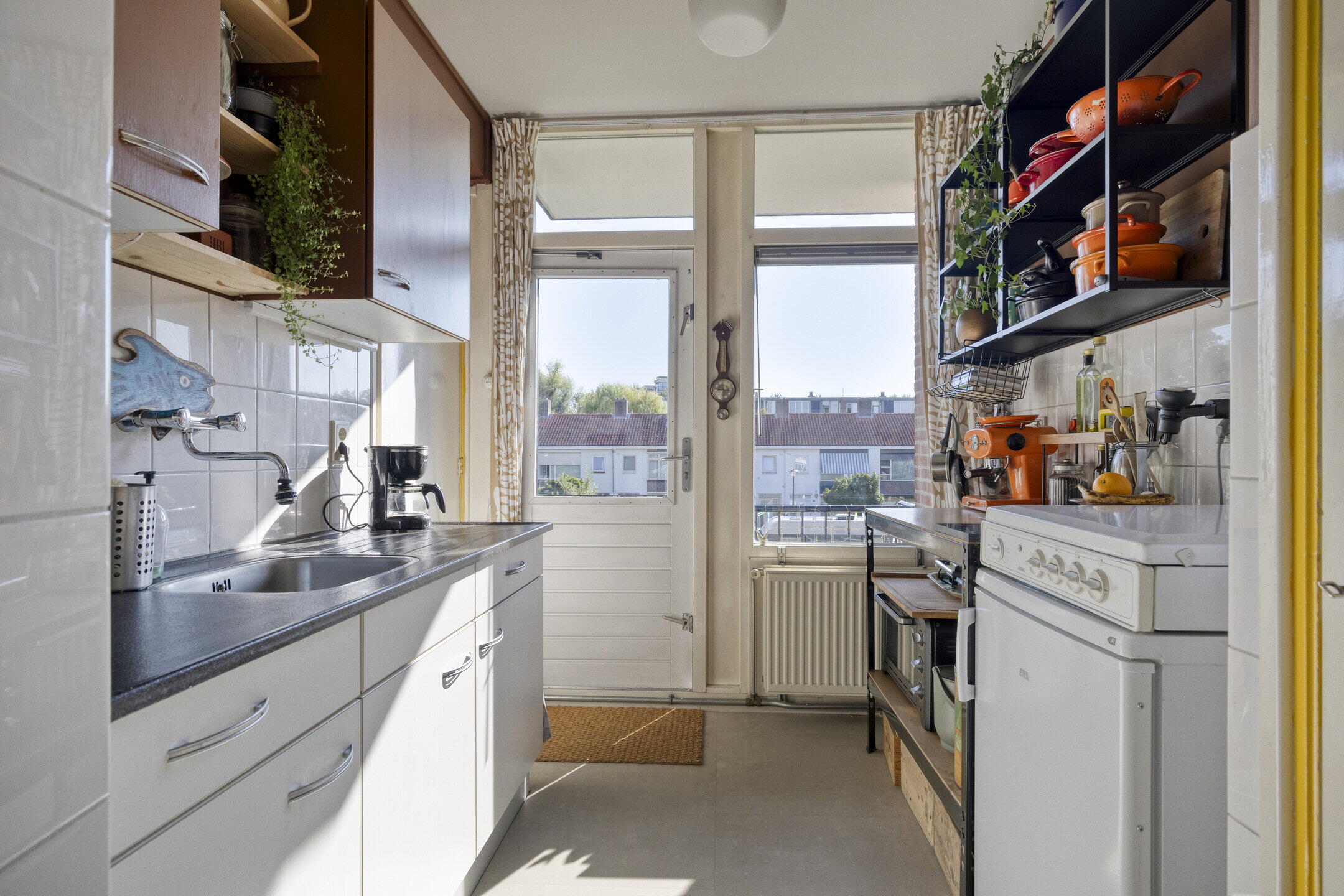 De dichte keuken (ca. 2.95 x 2.32m) bevindt zich aan de achterzijde en is voorzien van een keukenblok in dubbele wandopstelling, gaskookplaat, koel/vries combinatie, een bergkast en een spoelbak. Vanuit de keuken bereikt u het balkon aan de achterzijde (ochtendzon) en de badkamer.