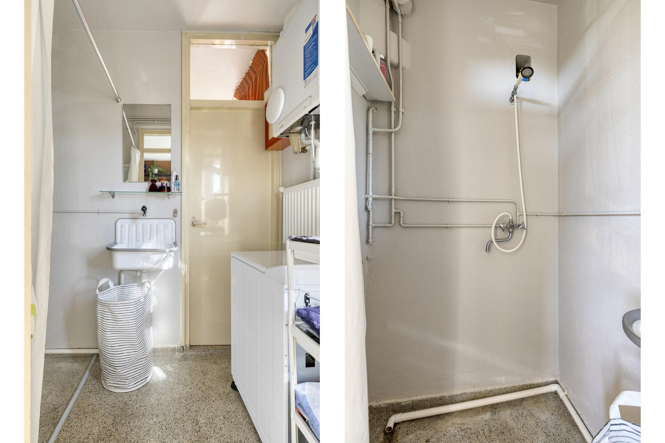 De badkamer (ca. 2.15 x 1.20m) beschikt over een douche, een wastafel en de aansluitpunten ten behoeve van de wasapparatuur.